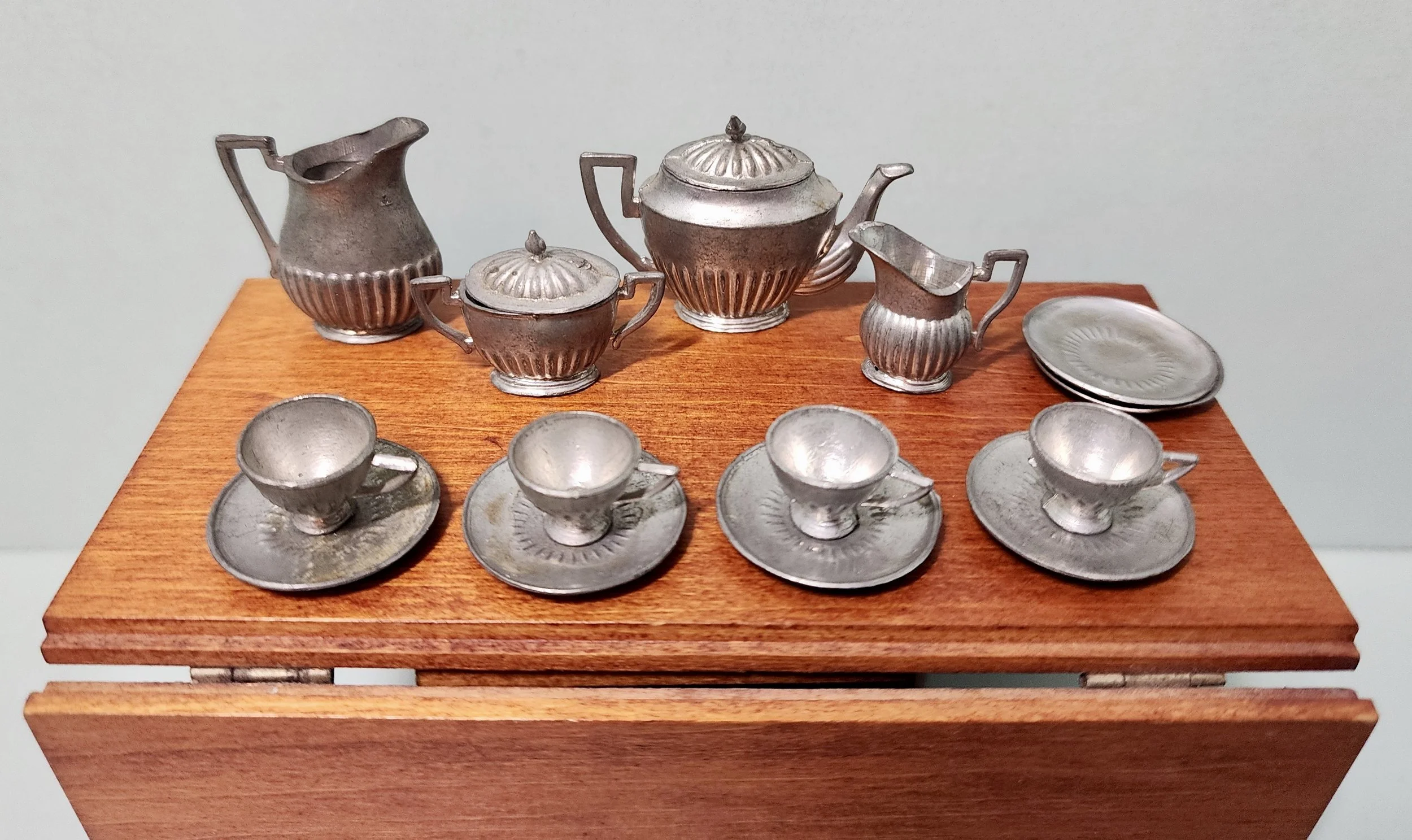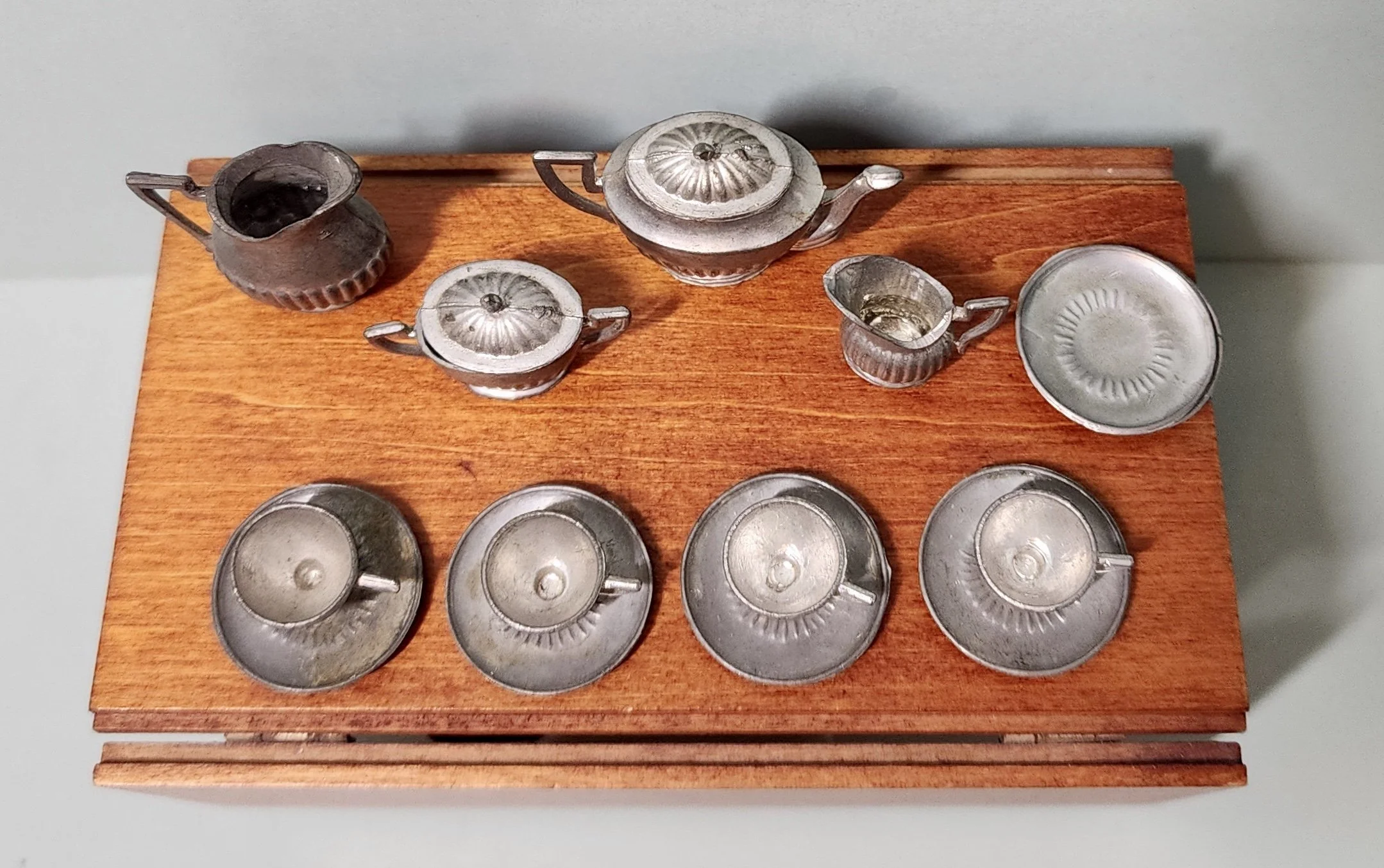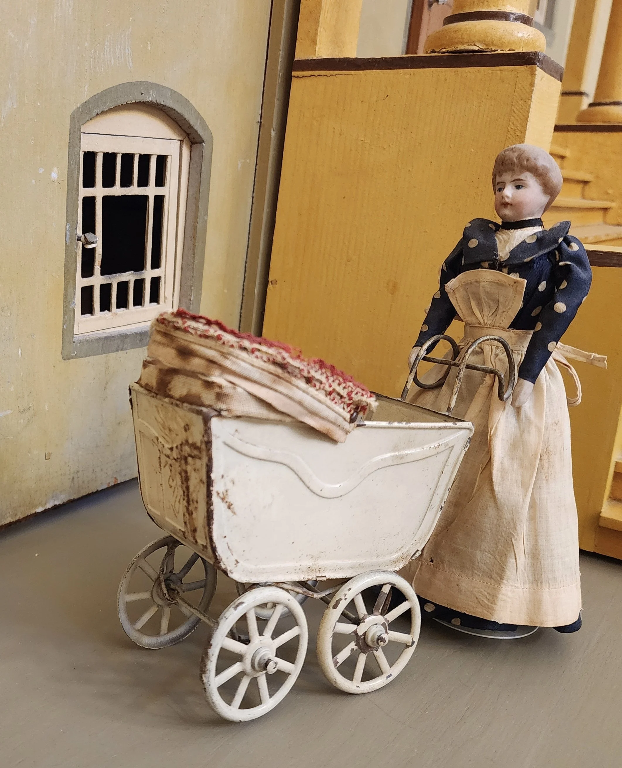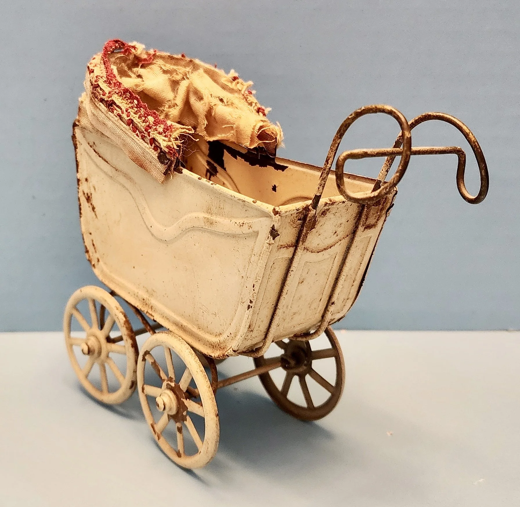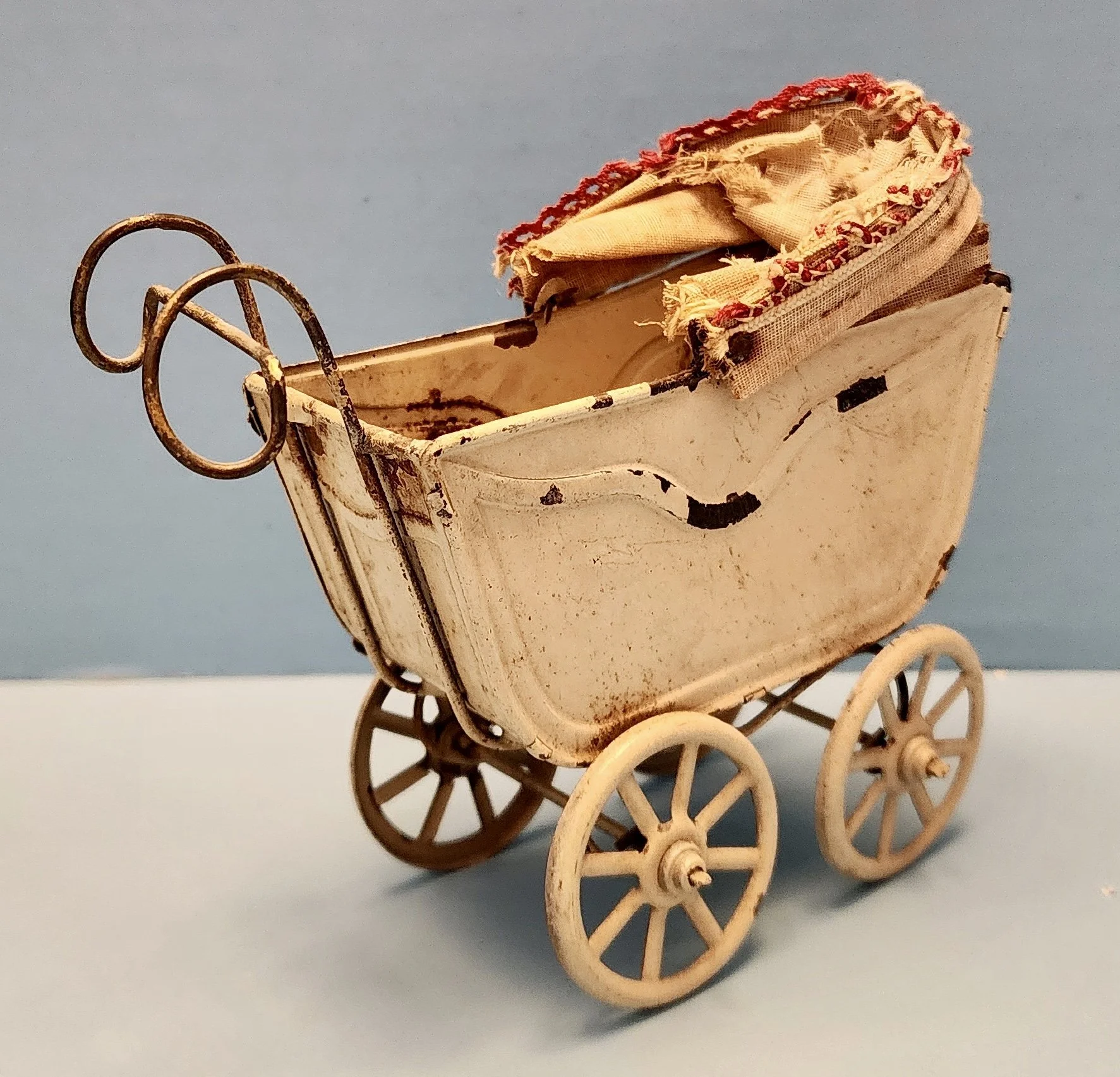 Accessories and Dolls Categories: All Dollhouses and Stores Antique and Vintage Furniture Accessories and Dolls Books and Publications All / 1930's German Metal Dollhouse Alarm Clock Pencil Sharpener $25.00 Antique German Soft Metal Mantel Clock $55.00 Antique German "Gasoline" Can $60.00 Antique Tin German Medicine Cabinet $65.00 Antique German Dollhouse Clock, Bakelite Pencil Sharpener $45.00 Vintage Metal Telephone, Made in England $20.00 Vintage Tin Coat Rack $25.00 Antique 7" China Head Doll $40.00 Antique German Tin Scale $45.00 German Soft Metal Serving Tray with Glass Insert $45.00 Antique German Dollhouse Soft Metal Cutlery Holder with Flatware $65.00 Vintage English Dollhouse Upright Vacuum $35.00 Antique German Dollhouse Typewriter $40.00 Antique German Dollhouse Tray $45.00 Antique Miniature Tin Cash Box $25.00 Antique German Coffee Server $55.00 Antique Tynietoy Hand Woven Rugs (2) $40.00 Antique German Bisque Dollhouse Man in Brown Suit $75.00 Antique German Bisque Dollhouse Doll $110.00 Antique Bisque Dollhouse Doll, Flapper Woman $70.00 Antique Bisque Dollhouse Woman 6 1/4" Tall $110.00 German Mantel Clock $55.00 German Serving Dish with Lid $5.00 German Crumb Brush and Pan $35.00 German Single Burner Hot Plate $20.00 German Metal Tea Set, 16 Pieces $95.00 German Soft Metal Electric Hot Plate $40.00 German Soft Metal Toaster With 2 Original Pieces of Toast $75.00 Vintage German Metal Coffee Set on a Tray $85.00 Vintage Miniature Black Tin Tray $25.00 Tynietoy Firewood Basket $25.00 German Metal Sewing Machine $70.00 Antique Miniature German Ballerina Figurine $25.00 Antique Tin German Dollhouse Baby Pram $25.00 Antique Gold Metal Wall Clock $85.00 Vintage German Dollhouse Lazy Susan That Actually Turns $45.00 Pair of Fancy French Dollhouse Candle Holders $35.00 Antique German Bisque 3 3/4" Dollhouse Maid $55.00 Antique Metal Serving Tray $35.00 Erna Meyer Girl in Plaid Dress $40.00 Erna Meyer Boy in Outdoor Outfit $45.00 Erna Meyer Girl in Orange Knickers $45.00 Erna Meyer Boy, Navy Blue Pants $45.00 Erna Meyer Girl in Blue Dress $45.00 Erna Meyer Dolls, Twins $65.00 Five Vintage Empty (Caco) Doll Boxes $15.00 German 5 1/2" Tall Black Bisque Dollhouse Doll $175.00 German Dollhouse Doll, 6 1/2" Tall $75.00 Pair of Small Vintage Steiff Mohair Bears $25.00 4 Vintage English Miniature Wax Dolls $45.00 Vintage German Caco Man Doctor $45.00 Vintage German Caco Man $45.00 Vintage Miniature Sugar Sample Boxes $15.00 4 Vintage Miniature Grocery Boxes $15.00 German Caco Baby in Cradle $35.00 German Caco Baby in Tin Stroller $35.00 German Caco Baby in Wicker Basket $35.00 Vintage Erna Meyer Brown Haired Baby Girl #3 $10.00 Vintage Erna Meyer Baby Girl Doll #2 $15.00 Vintage Erna Meyer Baby Doll #1 $15.00 Miniature Book, "The Call of Life", 1962 $20.00 Miniature Book, Harriet Beecher Stowe, Her Book, 1962 $55.00 Miniature Book, Grimm's Fairy Tales, 1963 $35.00 Caco Baby Doll with Changing Table and Accessories $55.00 Antique German Gottschalk Blanket / Towel Rack $32.00 1910 Gottschalk Kitchen Shelf $35.00 German Metal Push Lawn Mower, Tynietoy Accessory $65.00 German Electric Iron with Wall Plug $35.00 German Silverware Caddy with 18 Pieces of Silverware $65.00 German Three Piece Chafing Dish $55.00 German Metal Flat Iron $30.00 German Metal Cooking Set on Original Card $35.00 Antique German Kitchen Utensils in Metal Mesh Caddy $45.00 Bakelite "Art Deco" Style Table Top Radio $30.00 Antique German Tin Hinged Top Watering Can & Tub $55.00 German Kitchen Brush Holder with Brush $20.00 Vintage Pair of Metal Table Top Picture Frames, 1" Scale $30.00 Vintage 6 Piece Cleaning Set $20.00 Vintage Wooden Dollhouse Carpet Sweeper & Wooden Mop $15.00 German Painted Bisque Bride & Groom in Original Box $45.00 German wood Baby Walker with Bisque Baby Doll $35.00 German Dollhouse Table Lamp with Glass Shade $30.00 Antique German Dollhouse Lamp with Celluloid Shade $30.00 German Soft Metal Modern Style Bird Cage $25.00 Dolly Dear Book Ends with Books $20.00 Dolly Dear Framed Wall Picture $30.00 Dolly Dear Turkey Platters $15.00 Bodo Henning Cooking 4 Piece Cooking Set $15.00 Bodo Henning Dinner Set, Original Box $20.00 Vintage Turned Solid Brass Table Lamp with Removable Blue Shade $20.00 Vintage Pair of Solid Brass Table Lamps, Removable White Shades $35.00 Vintage Pair of Solid Brass Table Lamps with Burgundy Shades $35.00 Vintage Miniature Salt & Pepper Shaker with Stand $15.00 German "Miniature Kitchen Set" Mint on Card $45.00 German Sauce Pan Set on Original Card $25.00 Mint on Original Card, Set of 3 Sauce Pans, Made in Japan $20.00 Antique Small Doll Size Suitcase $35.00 Antique German Tin Canister Set of Two $55.00 Antique Wood Dollhouse Floor Lamp with Old Light Blub $20.00 Gottschalk Kitchen Rack with Metal Rod, 1910 $25.00 Vintage Tiny Dollhouse Brass Baby Pacifier $10.00 Antique German Miniature Tin Painted Bathtub, Most Likely Marklin $30.00 Antique Tin Dollhouse Stove with German Accessoried $55.00 German Soft Metal Cook Stove 1" Scale $55.00 Vintage Fireplace 3 Piece Tool Set with Stand, and Log Holder, 1" Scale $25.00 Vintage Plate of Fish with "Tripe" Sign, 1" Scale $5.00 Dowst - Tootsietoy Coffee Set, 8 Pieces $25.00 Strombecker 1" Scale Floor Lamp with Gold Swirl Shade $15.00 Strombecker 1" Scale Dark Blue Wooden Table Lamp $10.00 Grandmother Stovers "Father To Be Kit" Unopened 1957 $10.00 Vintage Metal Treadle Sewing Machine & Cash Register $10.00 Vintage Miniature Sewing Box $15.00 Vintage Wooden Christmas Garden Bridge $15.00 Vintage Metal Christmas Garden Trellis $15.00 Tiny Tin Furniture, 4 Pieces $15.00 "Bend-A-Family Mom, Brother & Sister with Stroller $10.00 "Zenith" Old Style Computer, Digital Clock $10.00