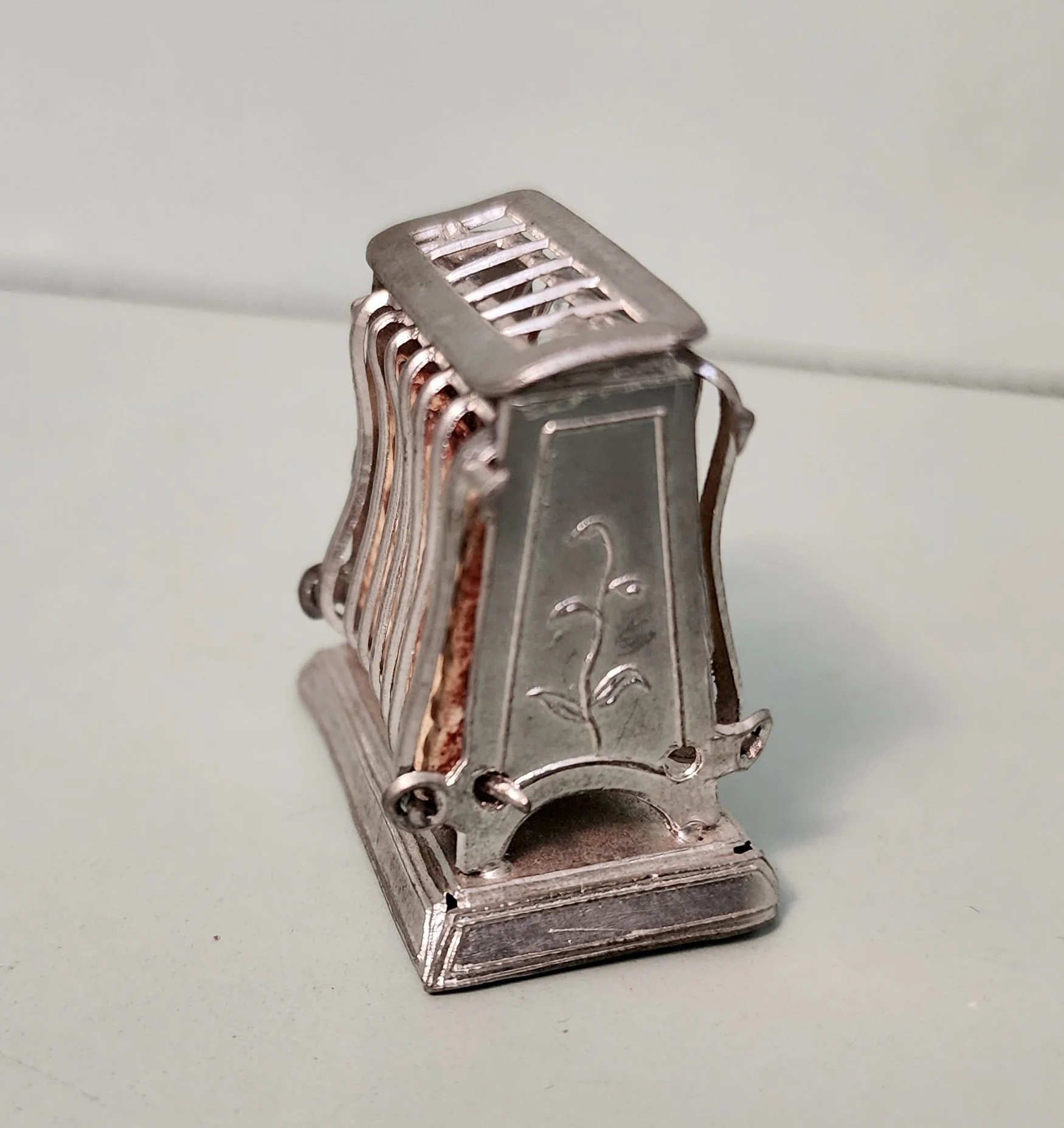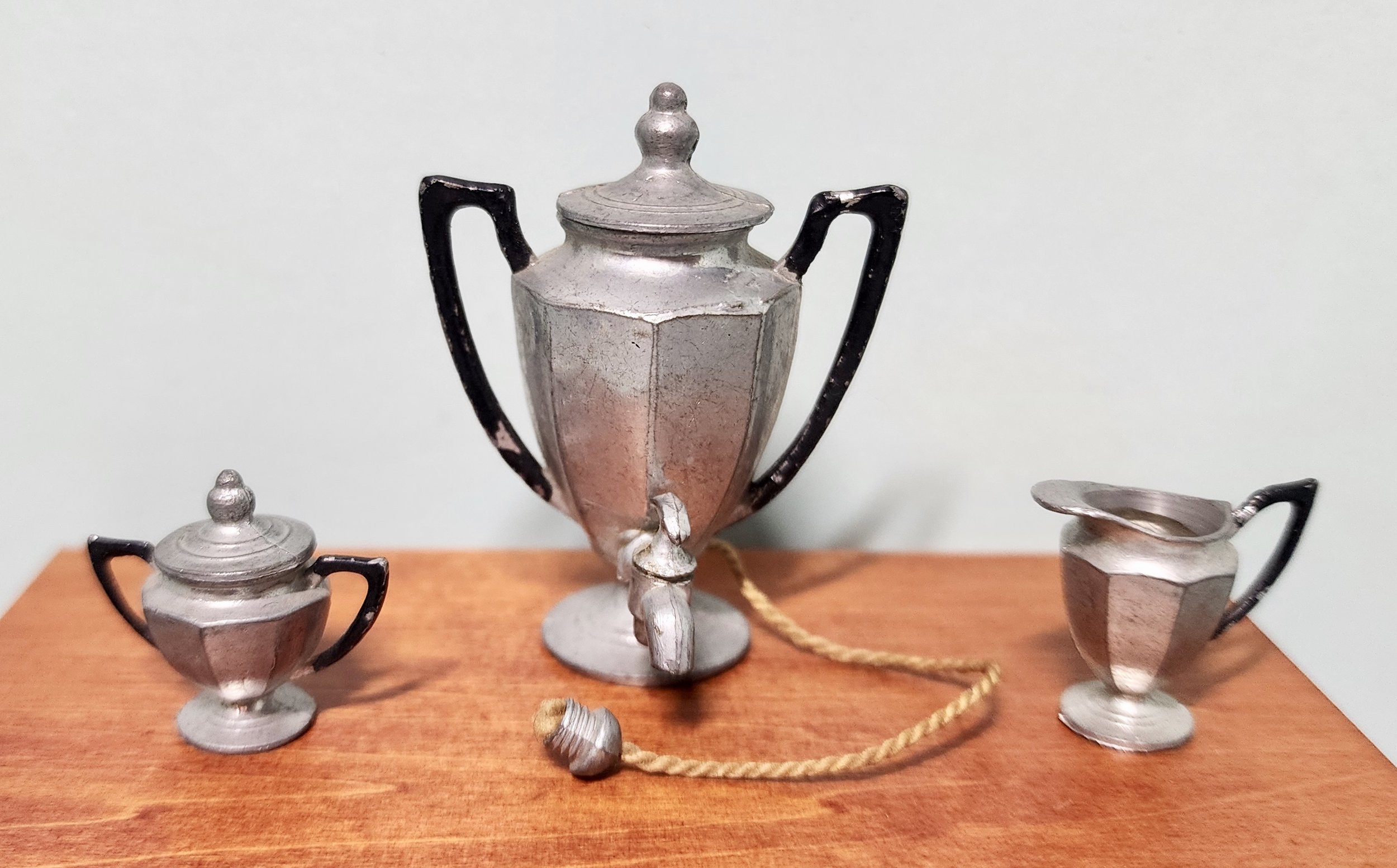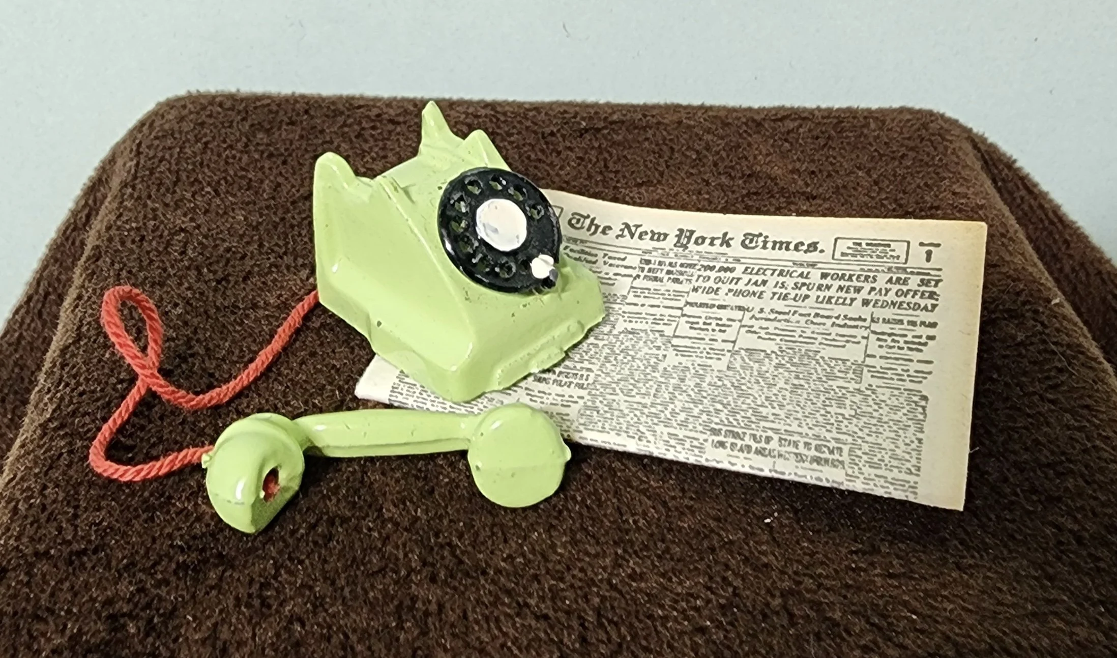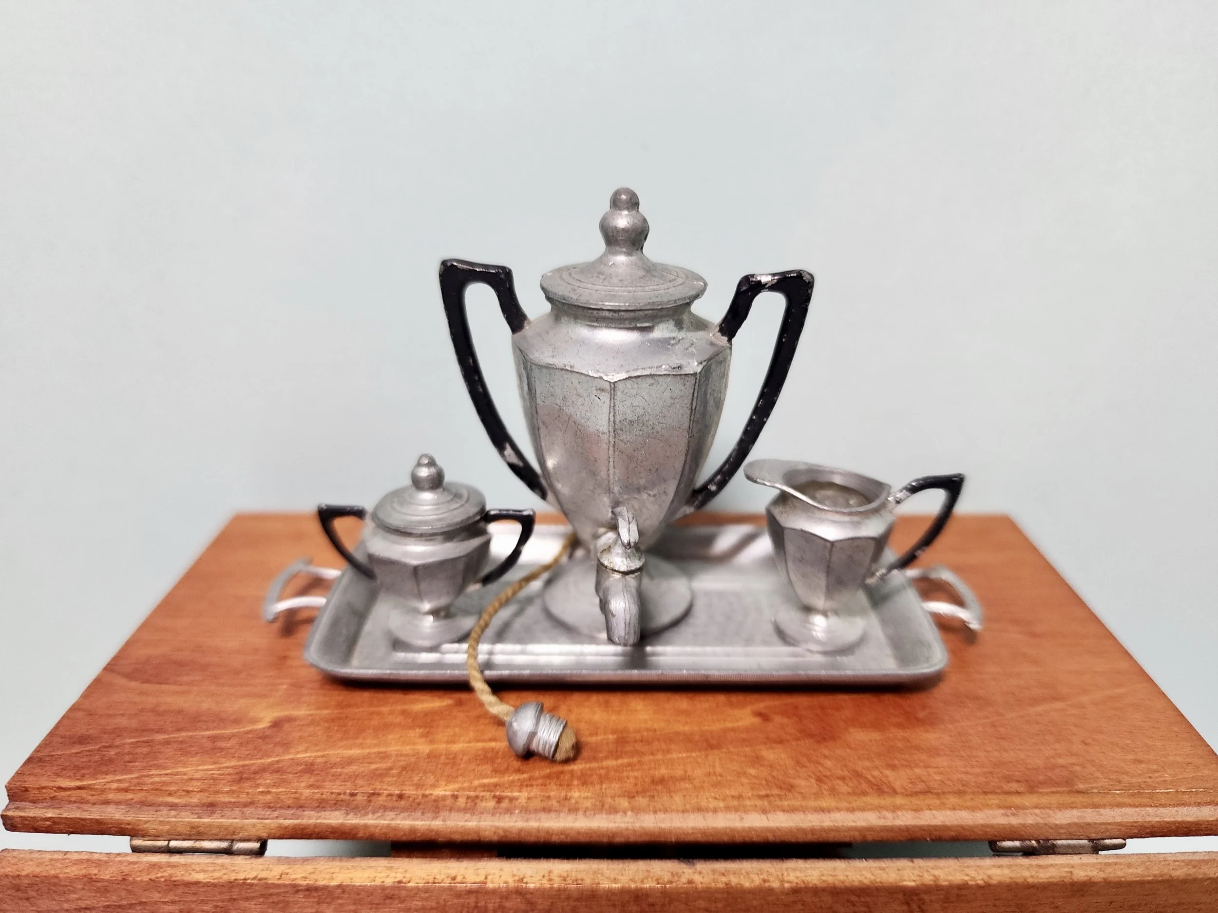Accessories and Dolls Categories: All Dollhouses and Stores Antique and Vintage Furniture Accessories and Dolls Books and Publications All / 1930's German Metal Dollhouse Alarm Clock Pencil Sharpener $25.00 Antique German Soft Metal Mantel Clock $55.00 Antique German "Gasoline" Can $60.00 Antique Tin German Medicine Cabinet $65.00 Antique German Dollhouse Clock, Bakelite Pencil Sharpener $45.00 Vintage Metal Telephone, Made in England $20.00 Vintage Tin Coat Rack $25.00 Antique 7" China Head Doll $40.00 Antique German Tin Scale $45.00 German Soft Metal Serving Tray with Glass Insert $45.00 Antique German Dollhouse Soft Metal Cutlery Holder with Flatware $65.00 Vintage English Dollhouse Upright Vacuum $35.00 Antique German Dollhouse Typewriter $40.00 Antique German Dollhouse Tray $45.00 Antique Miniature Tin Cash Box $25.00 Antique German Coffee Server $55.00 Antique Tynietoy Hand Woven Rugs (2) $40.00 Antique German Bisque Dollhouse Man in Brown Suit $75.00 Antique German Bisque Dollhouse Doll $110.00 Antique Bisque Dollhouse Doll, Flapper Woman $70.00 Antique Bisque Dollhouse Woman 6 1/4" Tall $110.00 German Mantel Clock $55.00 German Serving Dish with Lid $5.00 German Crumb Brush and Pan $35.00 German Single Burner Hot Plate $20.00 German Metal Tea Set, 16 Pieces $95.00 German Soft Metal Electric Hot Plate $40.00 German Soft Metal Toaster With 2 Original Pieces of Toast $75.00 Vintage German Metal Coffee Set on a Tray $85.00 Vintage Miniature Black Tin Tray $25.00 Tynietoy Firewood Basket $25.00 German Metal Sewing Machine $70.00 Antique Miniature German Ballerina Figurine $25.00 Antique Tin German Dollhouse Baby Pram $25.00 Antique Gold Metal Wall Clock $85.00 Vintage German Dollhouse Lazy Susan That Actually Turns $45.00 Pair of Fancy French Dollhouse Candle Holders $35.00 Antique German Bisque 3 3/4" Dollhouse Maid $55.00 Antique Metal Serving Tray $35.00 Erna Meyer Girl in Plaid Dress $40.00 Erna Meyer Boy in Outdoor Outfit $45.00 Erna Meyer Girl in Orange Knickers $45.00 Erna Meyer Boy, Navy Blue Pants $45.00 Erna Meyer Girl in Blue Dress $45.00 Erna Meyer Dolls, Twins $65.00 Five Vintage Empty (Caco) Doll Boxes $15.00 German 5 1/2" Tall Black Bisque Dollhouse Doll $175.00 German Dollhouse Doll, 6 1/2" Tall $75.00 Pair of Small Vintage Steiff Mohair Bears $25.00 4 Vintage English Miniature Wax Dolls $45.00 Vintage German Caco Man Doctor $45.00 Vintage German Caco Man $45.00 Vintage Miniature Sugar Sample Boxes $15.00 4 Vintage Miniature Grocery Boxes $15.00 German Caco Baby in Cradle $35.00 German Caco Baby in Tin Stroller $35.00 German Caco Baby in Wicker Basket $35.00 Vintage Erna Meyer Brown Haired Baby Girl #3 $10.00 Vintage Erna Meyer Baby Girl Doll #2 $15.00 Vintage Erna Meyer Baby Doll #1 $15.00 Miniature Book, "The Call of Life", 1962 $20.00 Miniature Book, Harriet Beecher Stowe, Her Book, 1962 $55.00 Miniature Book, Grimm's Fairy Tales, 1963 $35.00 Caco Baby Doll with Changing Table and Accessories $55.00 Antique German Gottschalk Blanket / Towel Rack $32.00 1910 Gottschalk Kitchen Shelf $35.00 German Metal Push Lawn Mower, Tynietoy Accessory $65.00 German Electric Iron with Wall Plug $35.00 German Silverware Caddy with 18 Pieces of Silverware $65.00 German Three Piece Chafing Dish $55.00 German Metal Flat Iron $30.00 German Metal Cooking Set on Original Card $35.00 Antique German Kitchen Utensils in Metal Mesh Caddy $45.00 Bakelite "Art Deco" Style Table Top Radio $30.00 Antique German Tin Hinged Top Watering Can & Tub $55.00 German Kitchen Brush Holder with Brush $20.00 Vintage Pair of Metal Table Top Picture Frames, 1" Scale $30.00 Vintage 6 Piece Cleaning Set $20.00 Vintage Wooden Dollhouse Carpet Sweeper & Wooden Mop $15.00 German Painted Bisque Bride & Groom in Original Box $45.00 German wood Baby Walker with Bisque Baby Doll $35.00 German Dollhouse Table Lamp with Glass Shade $30.00 Antique German Dollhouse Lamp with Celluloid Shade $30.00 German Soft Metal Modern Style Bird Cage $25.00 Dolly Dear Book Ends with Books $20.00 Dolly Dear Framed Wall Picture $30.00 Dolly Dear Turkey Platters $15.00 Bodo Henning Cooking 4 Piece Cooking Set $15.00 Bodo Henning Dinner Set, Original Box $20.00 Vintage Turned Solid Brass Table Lamp with Removable Blue Shade $20.00 Vintage Pair of Solid Brass Table Lamps, Removable White Shades $35.00 Vintage Pair of Solid Brass Table Lamps with Burgundy Shades $35.00 Vintage Miniature Salt & Pepper Shaker with Stand $15.00 German "Miniature Kitchen Set" Mint on Card $45.00 German Sauce Pan Set on Original Card $25.00 Mint on Original Card, Set of 3 Sauce Pans, Made in Japan $20.00 Antique Small Doll Size Suitcase $35.00 Antique German Tin Canister Set of Two $55.00 Antique Wood Dollhouse Floor Lamp with Old Light Blub $20.00 Gottschalk Kitchen Rack with Metal Rod, 1910 $25.00 Vintage Tiny Dollhouse Brass Baby Pacifier $10.00 Antique German Miniature Tin Painted Bathtub, Most Likely Marklin $30.00 Antique Tin Dollhouse Stove with German Accessoried $55.00 German Soft Metal Cook Stove 1" Scale $55.00 Vintage Fireplace 3 Piece Tool Set with Stand, and Log Holder, 1" Scale $25.00 Vintage Plate of Fish with "Tripe" Sign, 1" Scale $5.00 Dowst - Tootsietoy Coffee Set, 8 Pieces $25.00 Strombecker 1" Scale Floor Lamp with Gold Swirl Shade $15.00 Strombecker 1" Scale Dark Blue Wooden Table Lamp $10.00 Grandmother Stovers "Father To Be Kit" Unopened 1957 $10.00 Vintage Metal Treadle Sewing Machine & Cash Register $10.00 Vintage Miniature Sewing Box $15.00 Vintage Wooden Christmas Garden Bridge $15.00 Vintage Metal Christmas Garden Trellis $15.00 Tiny Tin Furniture, 4 Pieces $15.00 "Bend-A-Family Mom, Brother & Sister with Stroller $10.00 "Zenith" Old Style Computer, Digital Clock $10.00